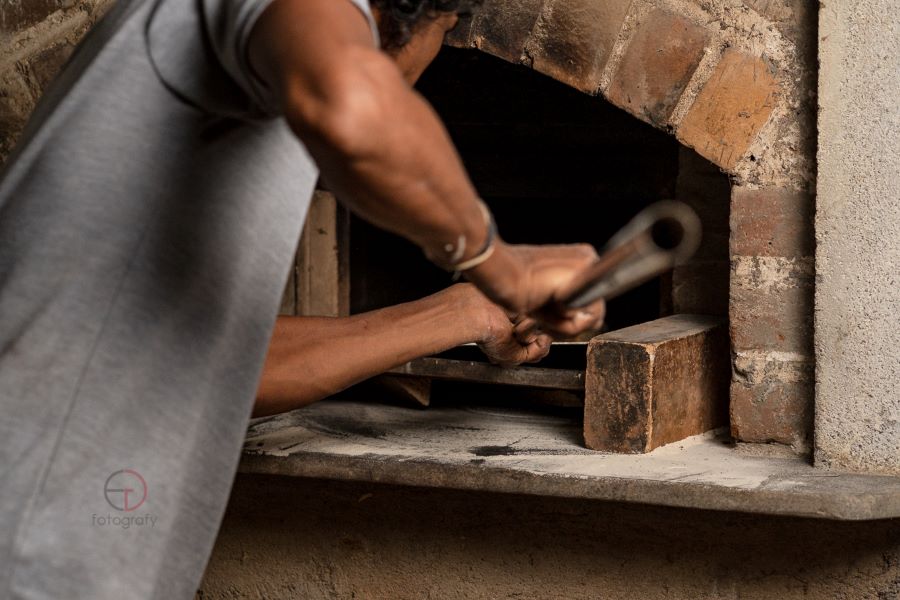 At night before going to bed, I fire up the oven and close its entrance with a few bricks, making sure to leave small holes for oxygen to keep feeding the fire. Then, by 4-5 am, the fire is ready. I spread the heat out evenly and at around 6-7 am I put the bread inside.